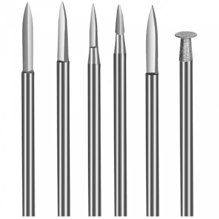 Набор из 6 конических фрез разработан для выполнения тонких линий, узорчатых элементов и рельефных изображений по дереву. Малые размеры и разнообразные формы фрез обеспечивают высокую точность при работе с мелкими деталями.