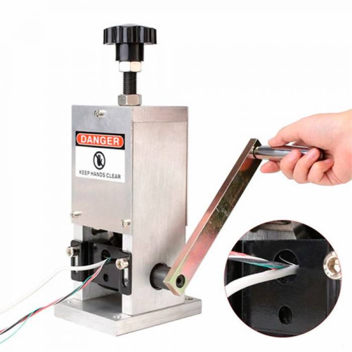 Машинка для зачистки медных / алюминиевых проводов / кабелей с возможностью управления с помощью ручки, или дрели. Подходит для удаления пластиковой и резиновой изоляции с провода толщиной до 25 мм. Представляет из себя прочную конструкцию из алюминиевого сплава с четырьмя отверстиями в основании для закрепления устройства на столе.