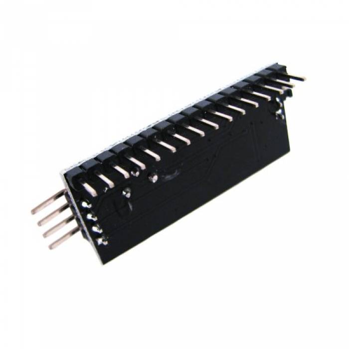 Модуль собран на микросхеме PCF8574T / HLF8574T, подключение и передача данных происходят через 14 и 15 пины. Подсветка и контраст регулируются потенциометром. Совместим с 1602 ЖК дисплеем.