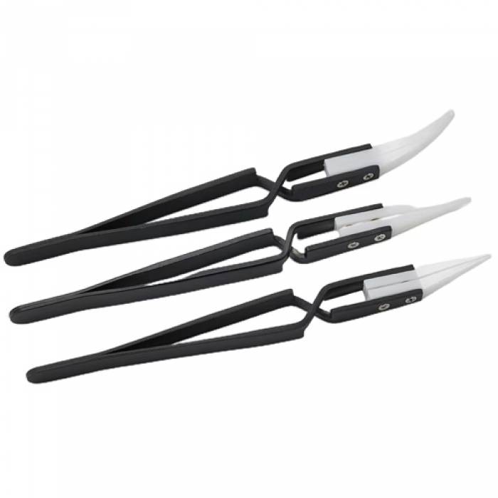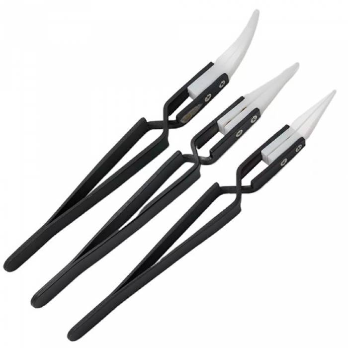 Набор разжимных пинцетов с электроизоляционными наконечниками из циркониевой керамики для пайки. Имеют качественную сборку, губки смыкаются плотно, что позволяет работать с различными мелкими деталями.