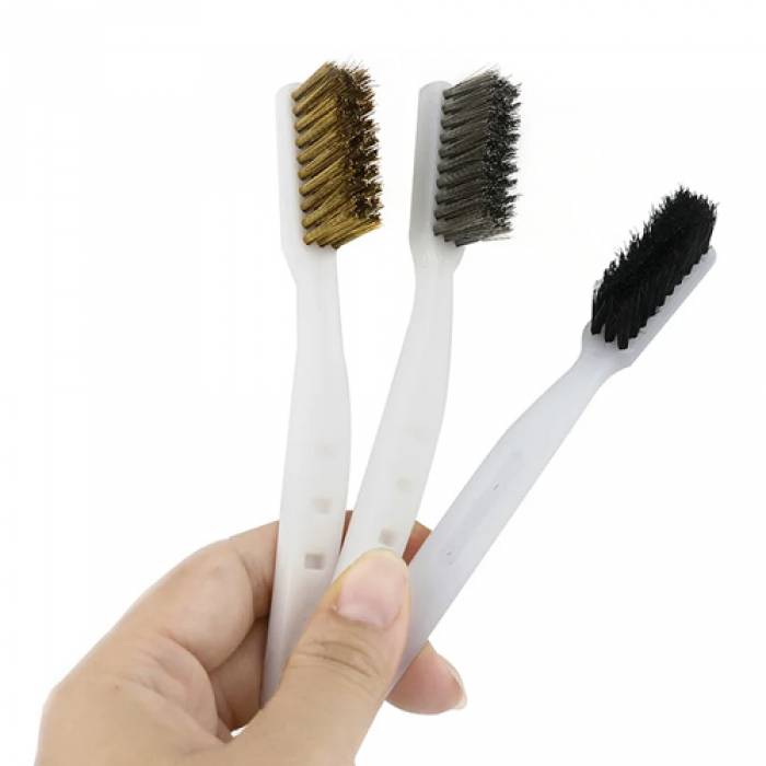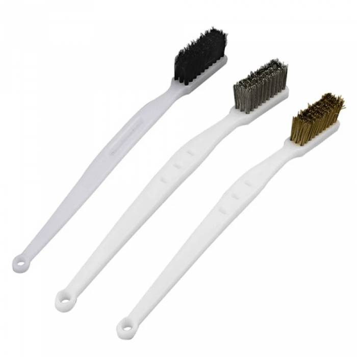 Набор из трёх проволочных щеток по металлу, которые изготовлены из стальной (нержавейка), нейлоновой и латунной проволоки.