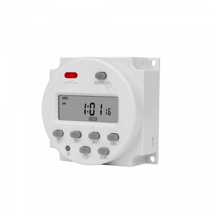 Программируемый недельный таймер CN101A для замыкания/размыкания электрической цепи согласно установленным интервалам времени. Оснащен ЖК-дисплеем. Имеет нормально разомкнутый контакт и четыре 3.2 мм отверстия для монтажа.