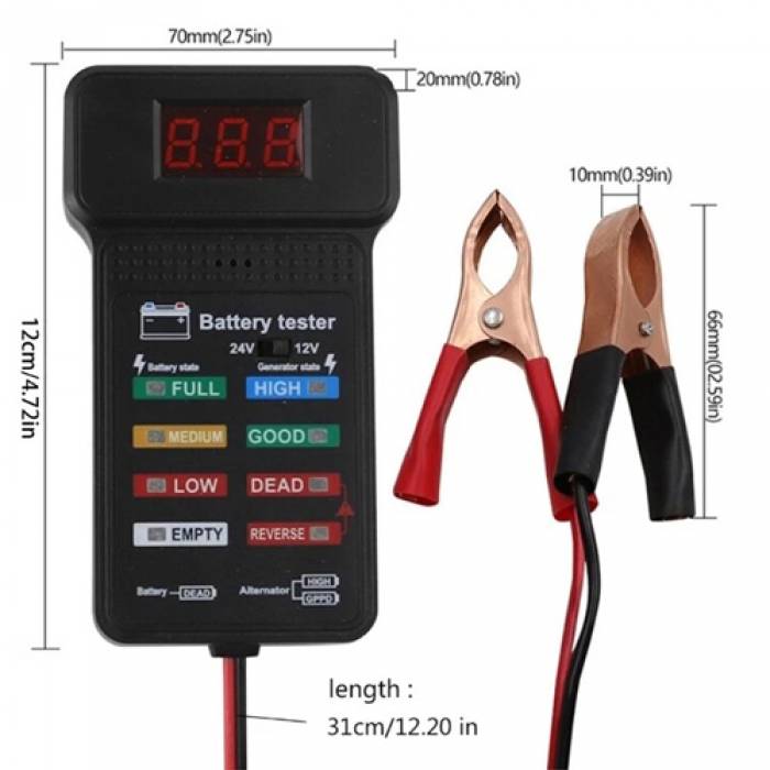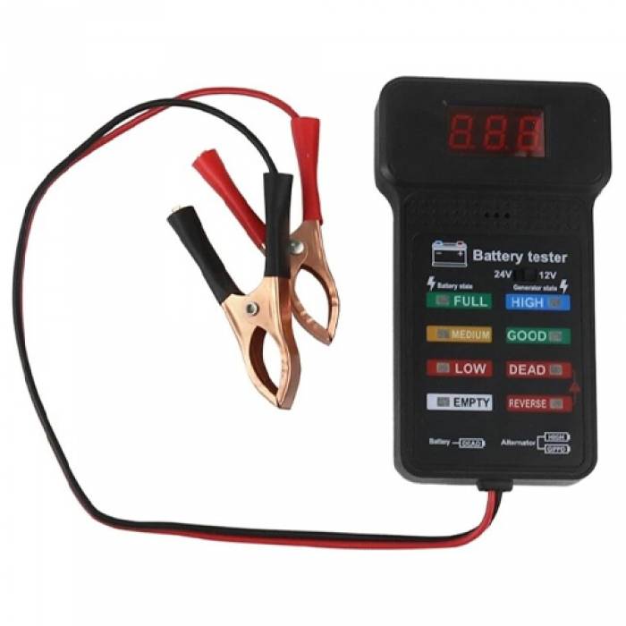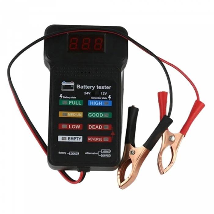 Универсальный тестер автомобильного аккумулятора предназначен для быстрой диагностики состояния батареи. Оснащен цифровым дисплеем, который отображает текущее напряжение АКБ, а также индикаторной панелью с световой индикацией, которая позволит оценить реальное состояние батареи. Тестер подходит для для легковых и грузовых автомобилей, мотоциклов, катеров и других видов транспорта.