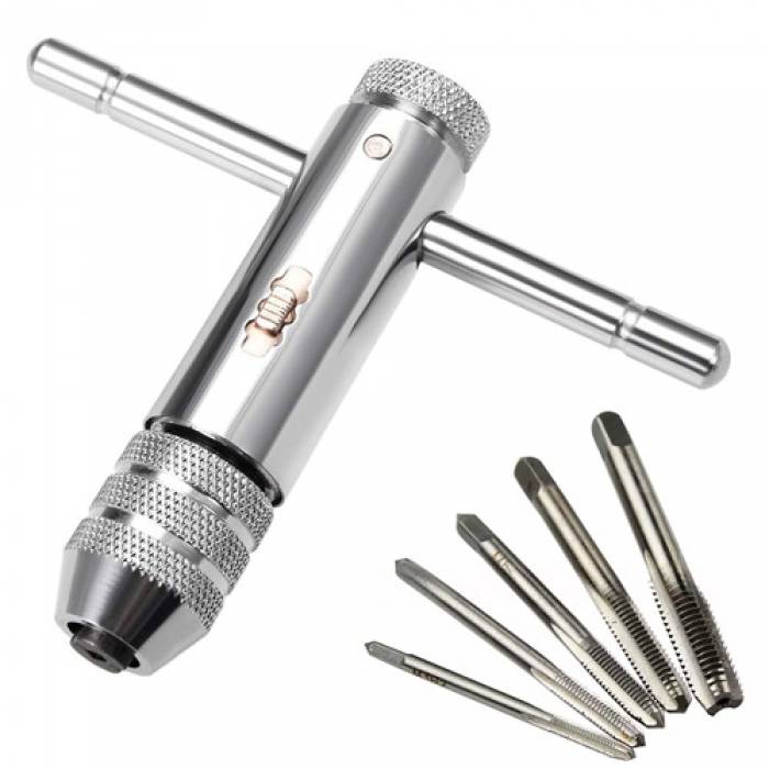 Комплектуется набором из 5 метчиков (M3, M4, M5, M6, M8) для нарезания внутренних резьб.